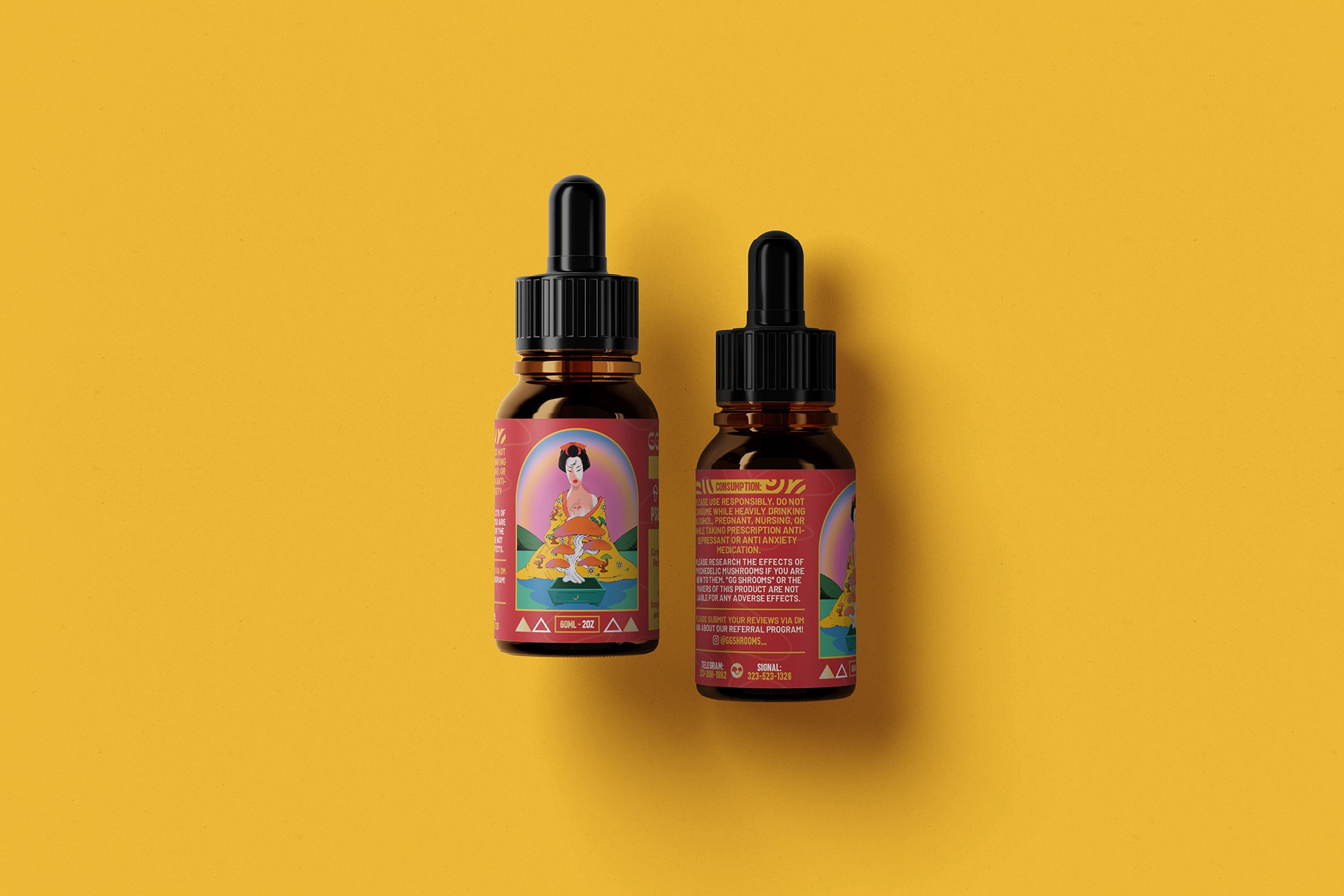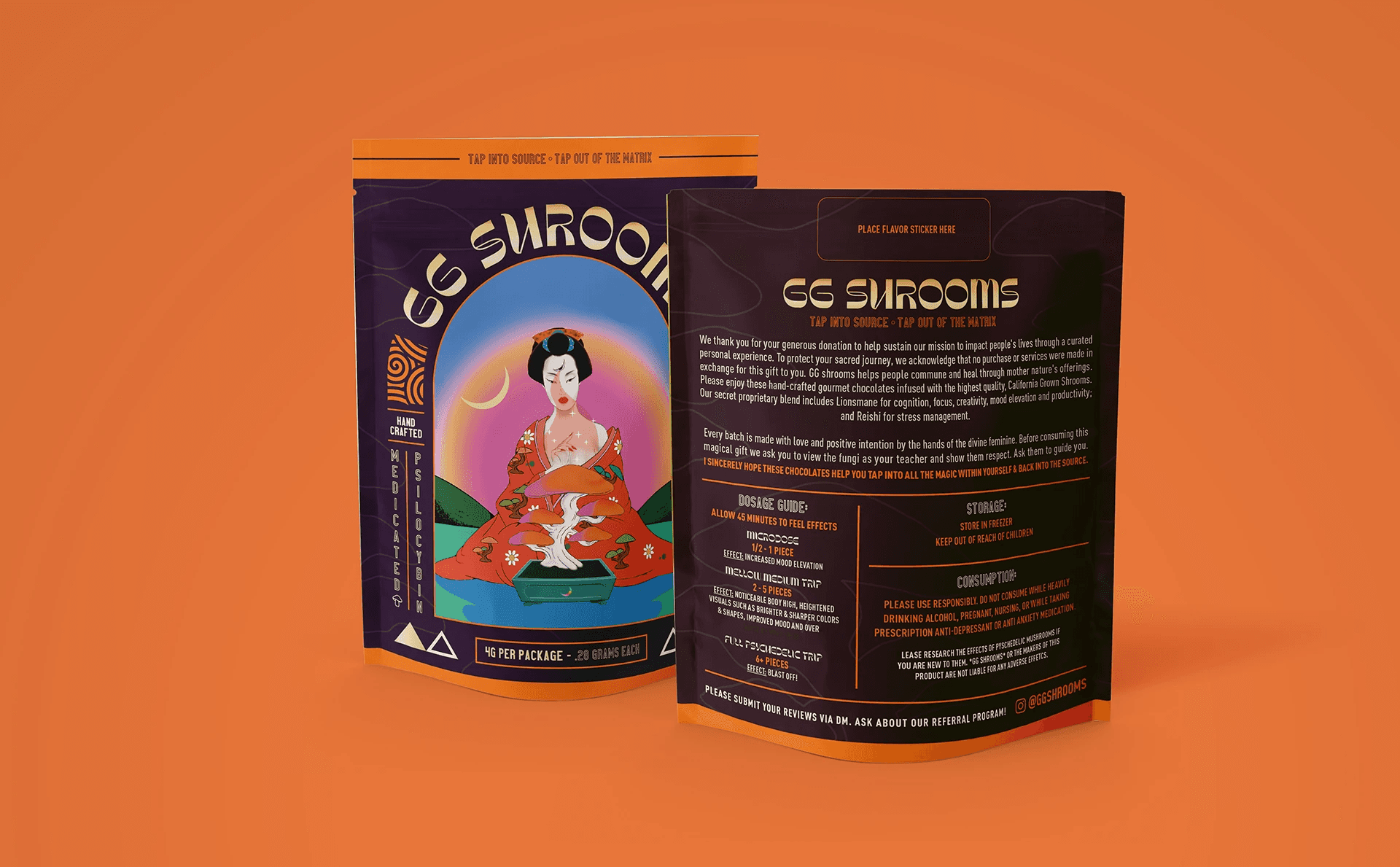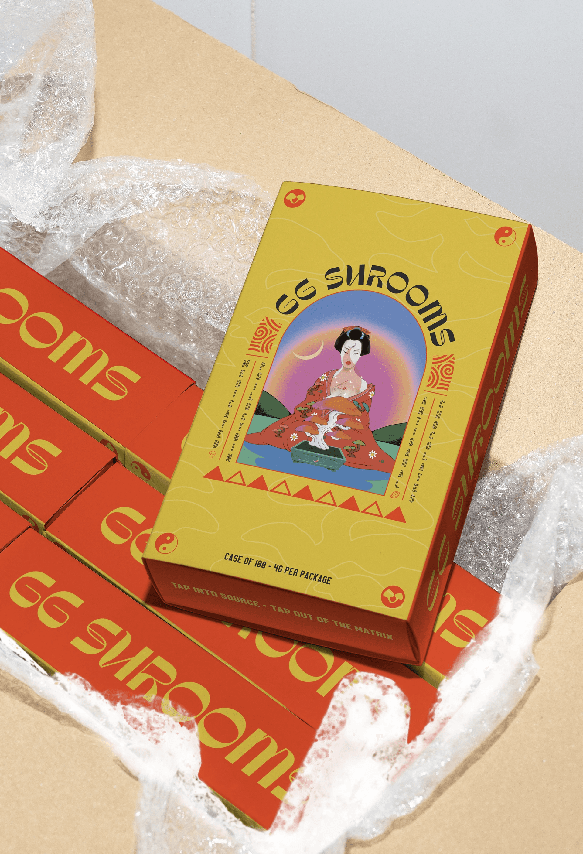 GG Shrooms is a top tier artisanal chocolate manufacturer specializing in adaptogenic and medicinal hand-crafted confections. Towards the end of '23 I was contacted to rebrand GG Shrooms and rework all of the packaging to an updated, more refined look that retains the original Geisha Illustration on all chocolate packaging designs. Custom packaging was developed for a range of products including: Chocolates, Tinctures and Tablets.