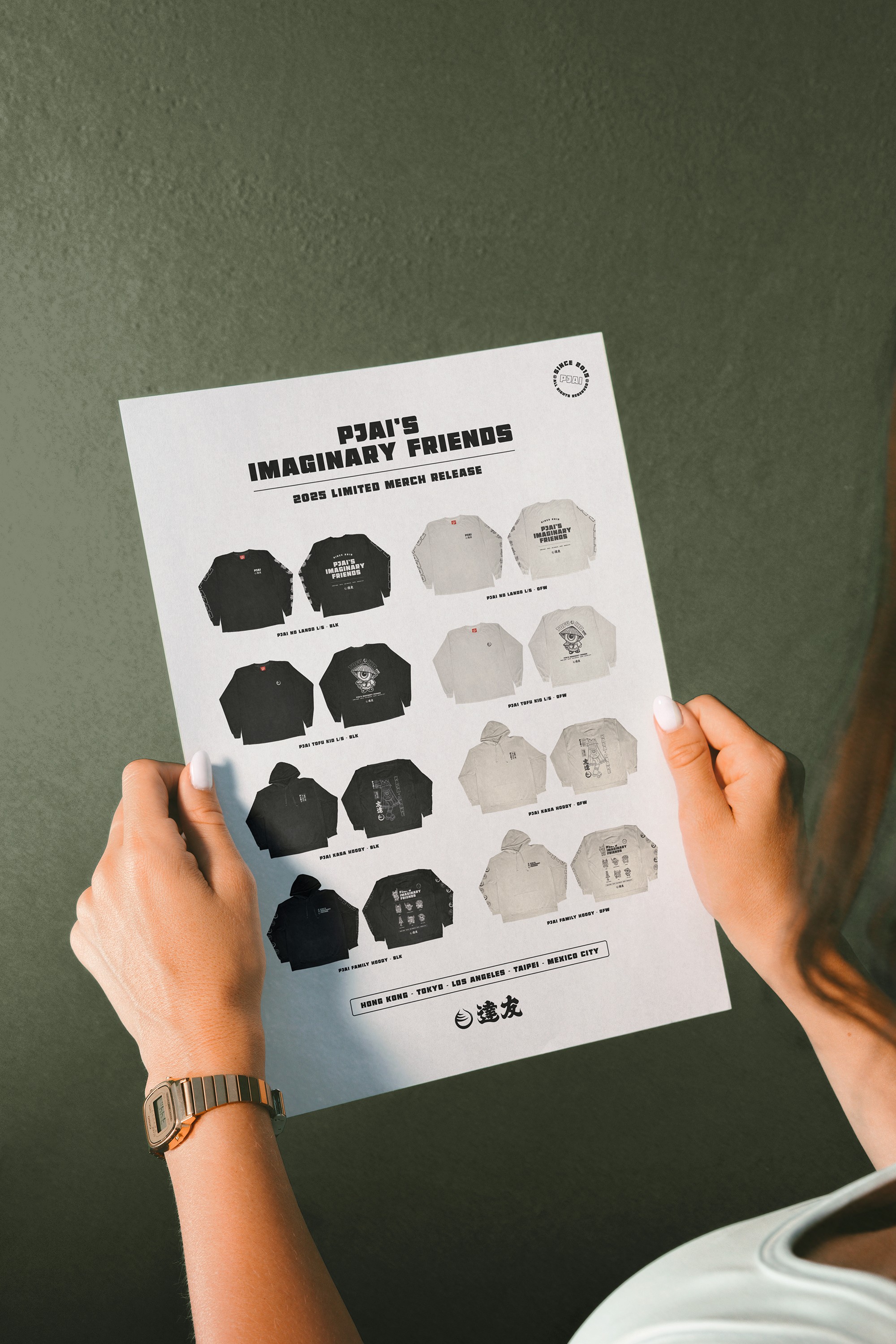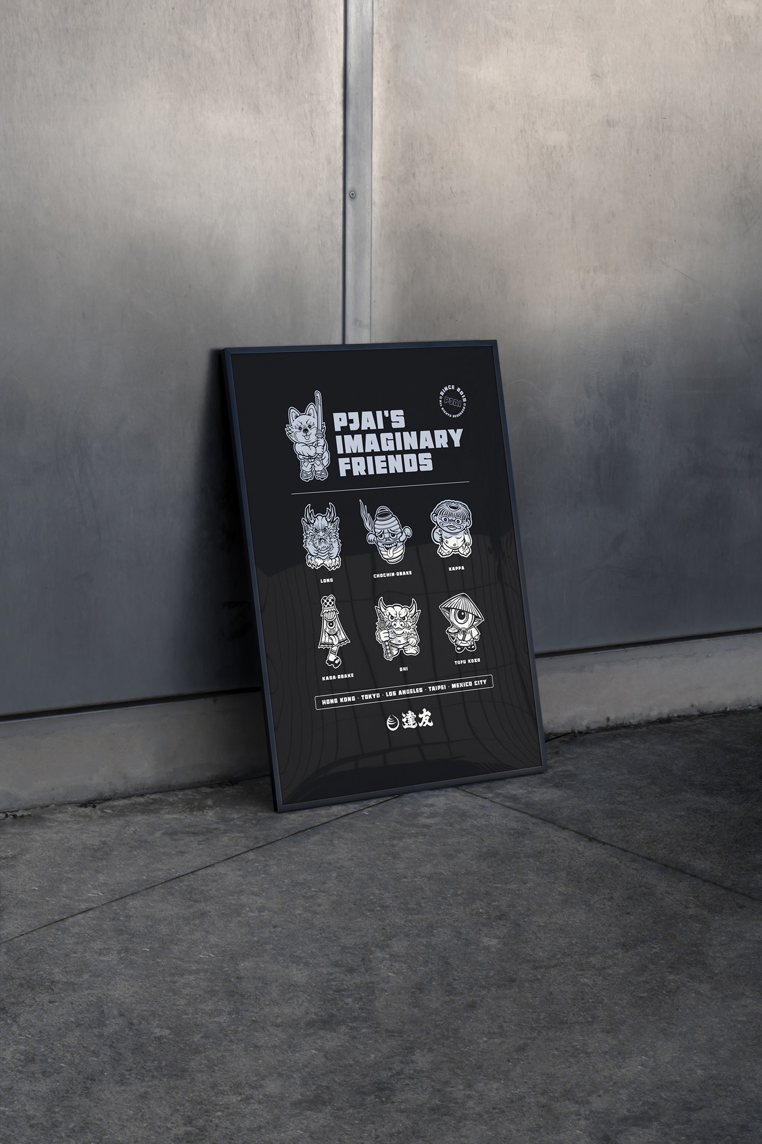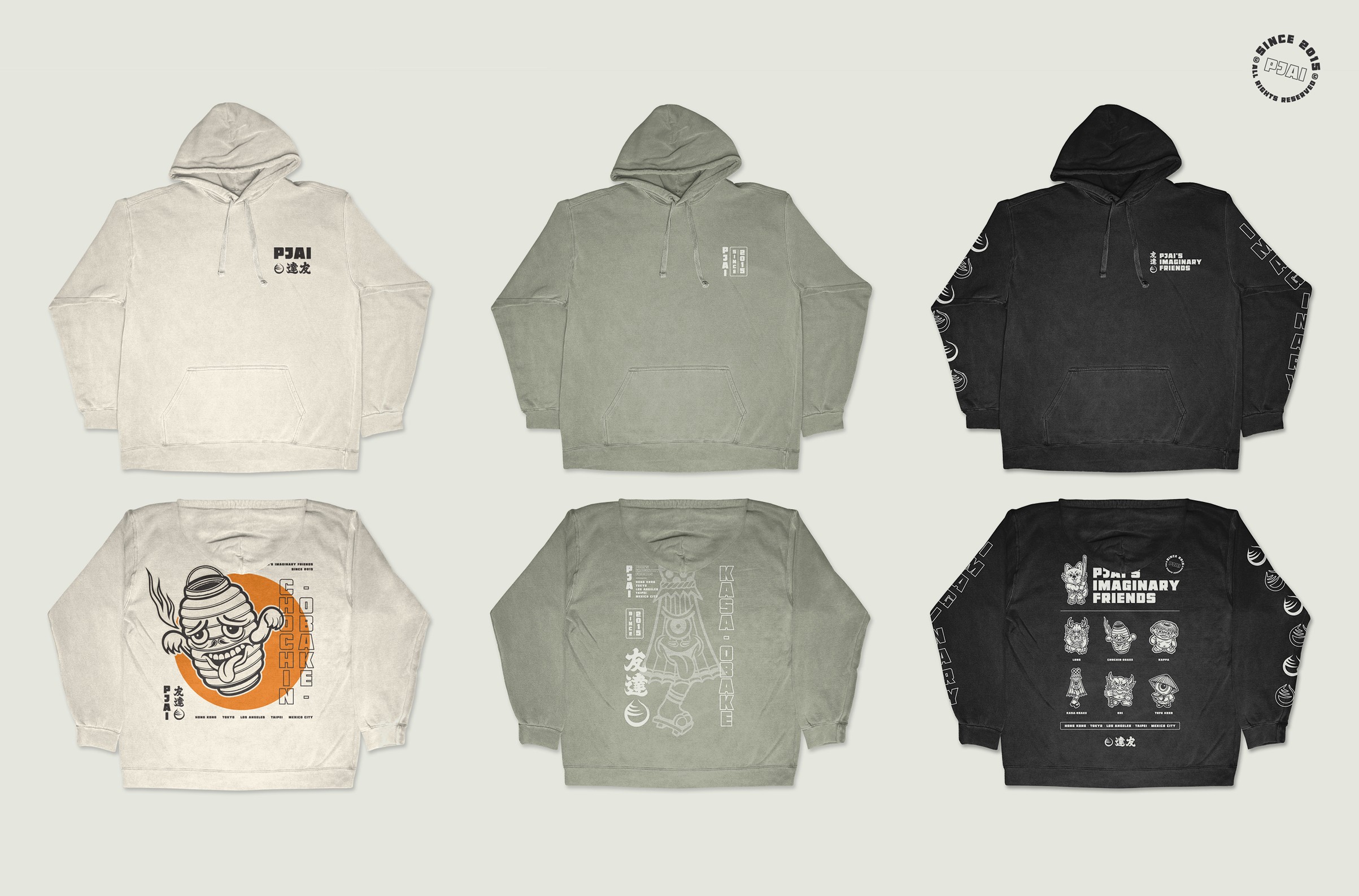 One of my close friends and longtime artistic sensei, Daniel Sinnes, reached out to collaborate on merch designs for his upcoming vinyl toy exhibition in Hong Kong. Titled Pjai’s Imaginary Friends, the show and product release brought a cast of characters to life. Without hesitation, I asked him to send over any existing vectors for each character and got straight to work. The final designs launched globally and sold successfully, with particularly strong traction in the Asian market.