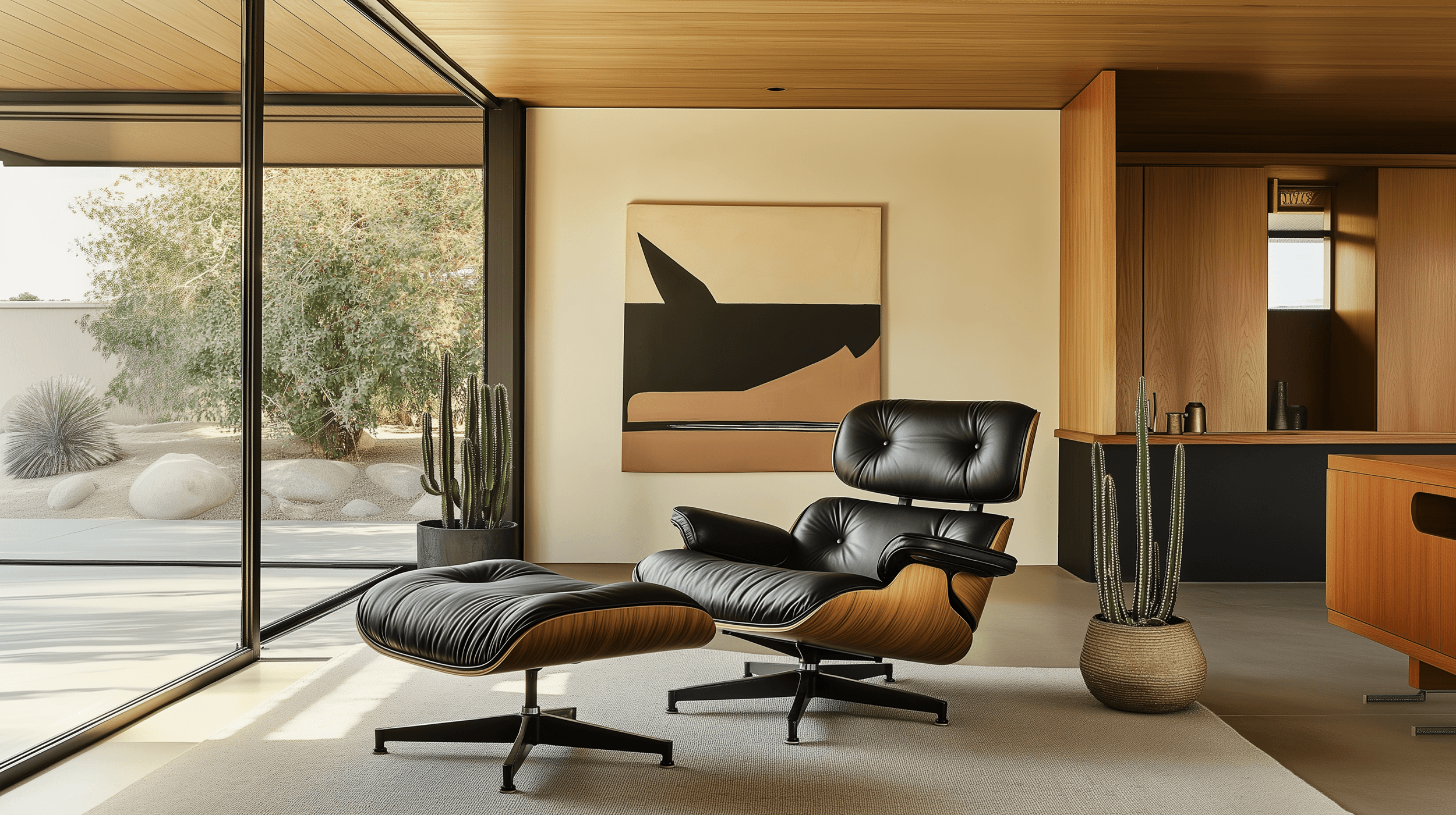 "A modernist chair and ottoman sitting in the living room of a mid-century Eichler style home, mid-day with rays of natural lighting coming through the windows. Potted cactus's on floor indoors near the chair with contemporary inspired art on the walls."