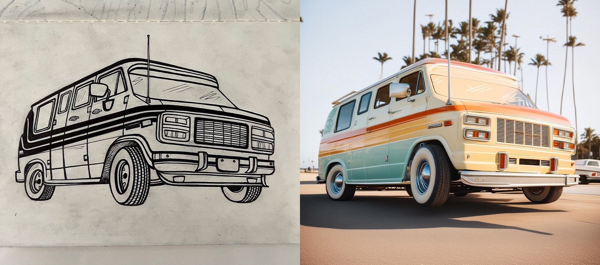 I spent a lot of time experimenting in Midjourney, especially with character and style references. The header image and prompt quoted above is a good example of that workflow: I generated a mid-century modern living room in a desert setting, using an Eames chair as the character reference for the AI to integrate into the scene. The second image in this entry below shows a different approach—taking a simple sketch or line drawing and bringing it to life through SDXL ControlNet. Watching a drawing I made turn into a fully realized image with the right prompt and a single click was honestly wild to witness.